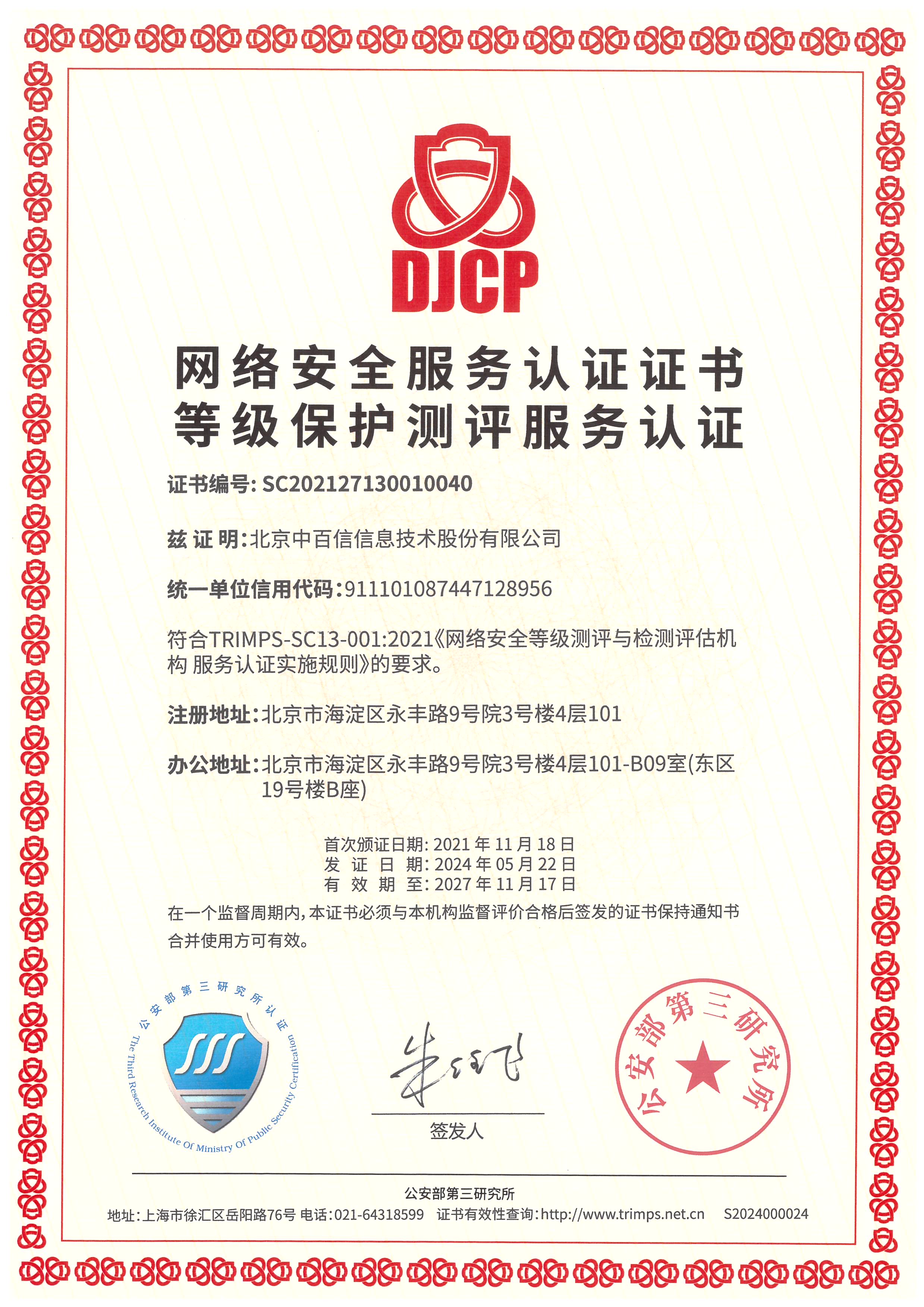 中百信于6月30日正式荣获数据安全评估资质认证(一级)证书。