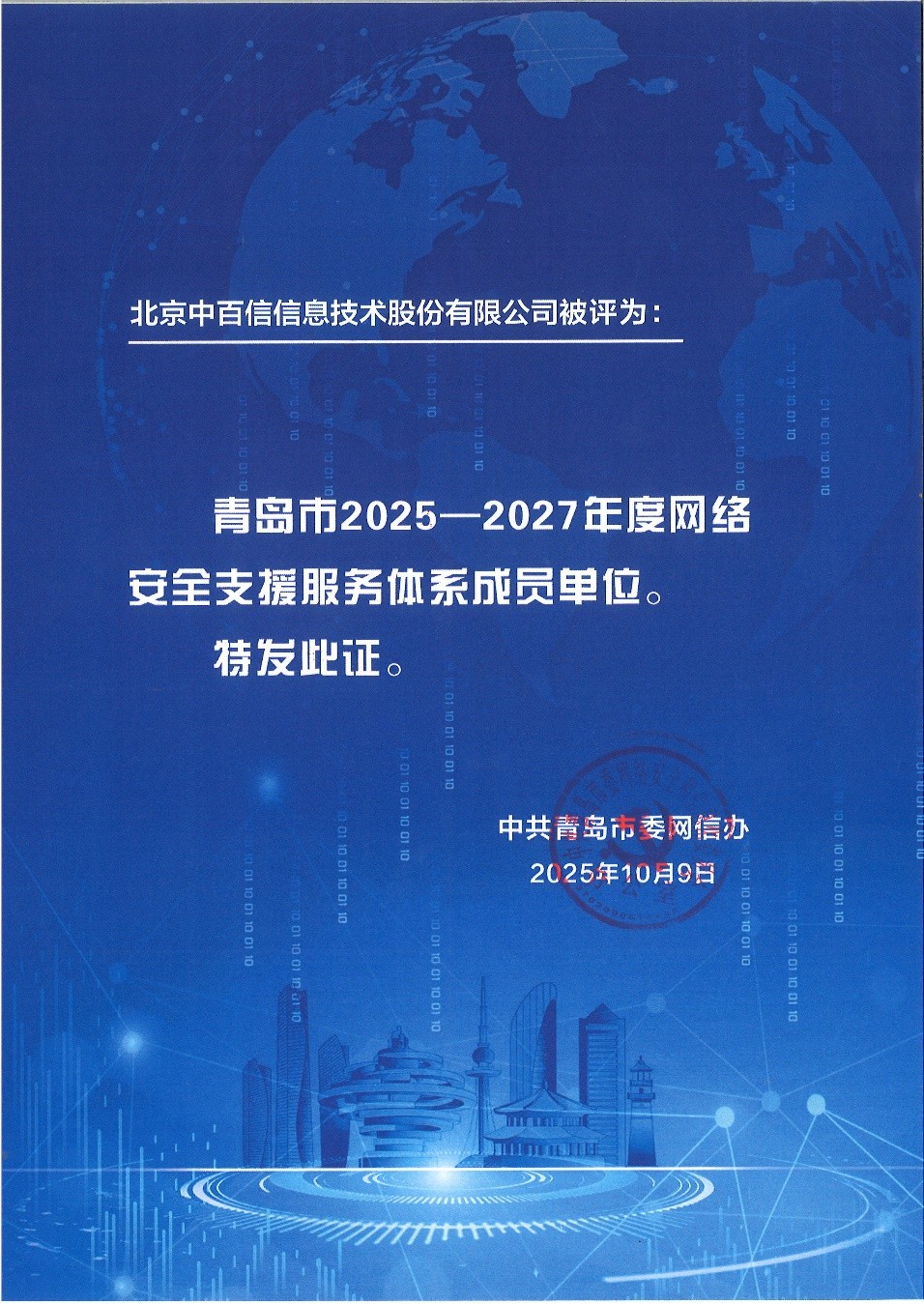 能跻身青岛市安全支援服务体系,源于中百信在网络安全领域多年的深耕细作与权威资质认证的双重加持,这份实力既扎根于长期实践的沉淀,也经得住行业最高标准的检验。