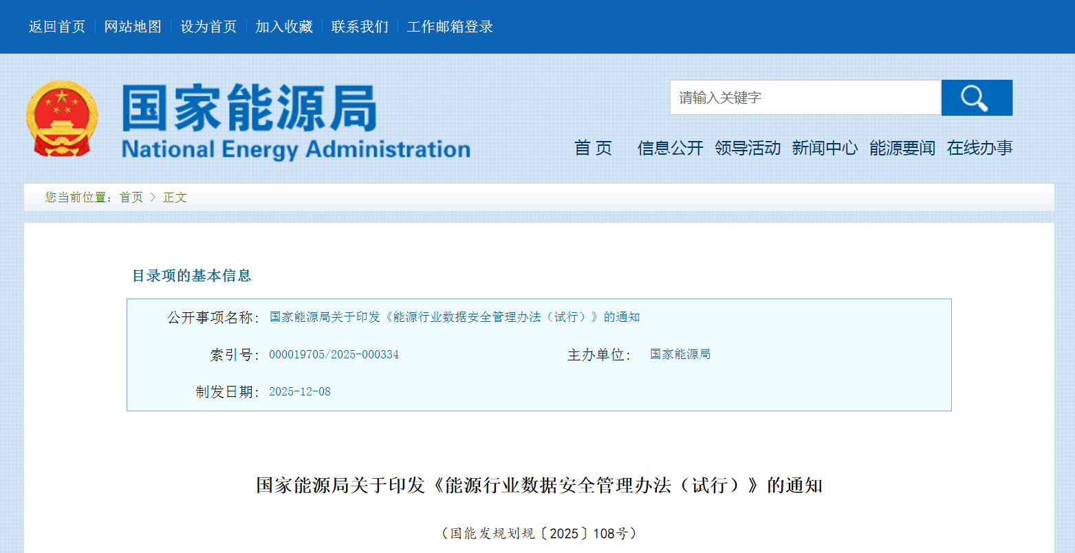 国家能源局印发:《能源行业数据安全管理办法(试行)》